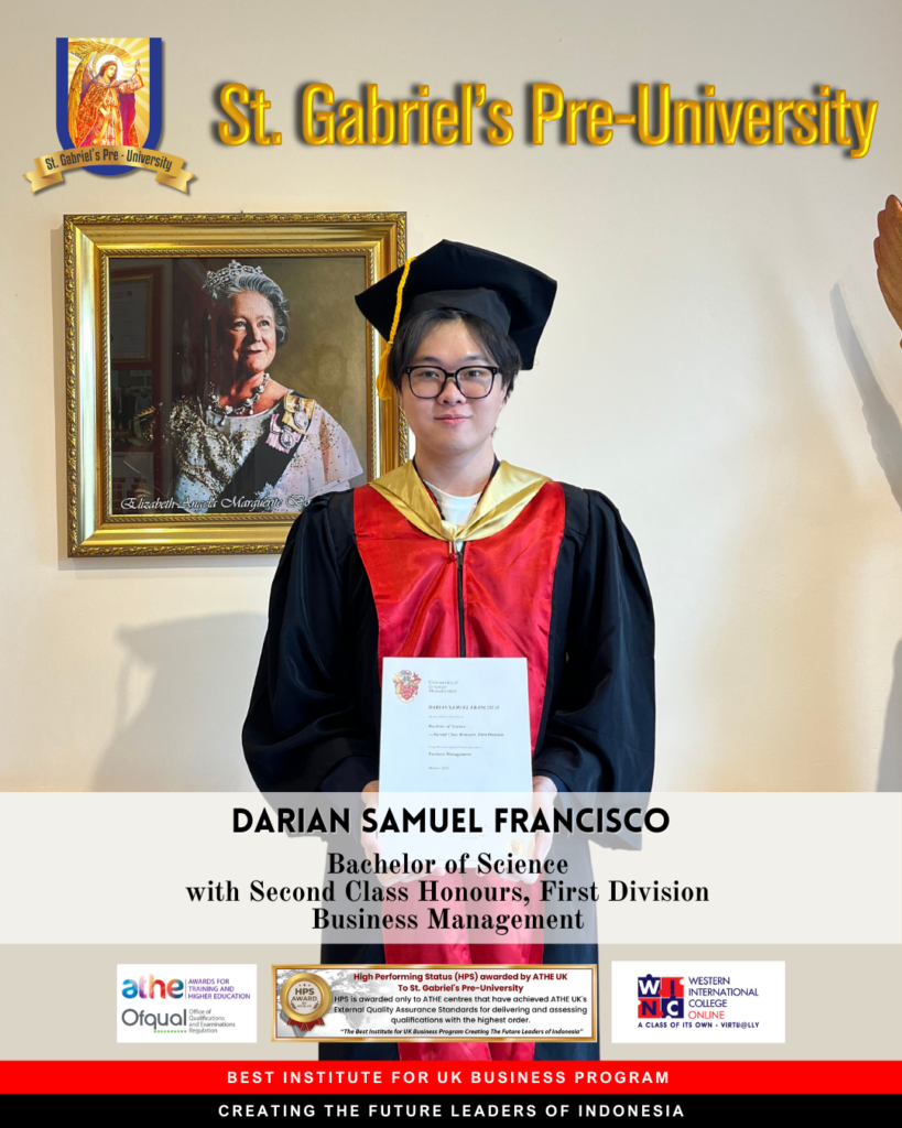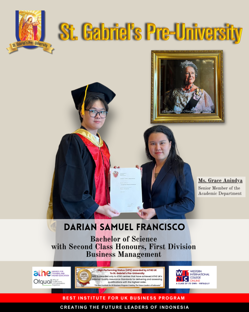 Beginning his academic journey at St. Gabriel’s in Jakarta, Darian progressed through a structured UK education pathway designed to prepare students for international standards of higher education. After completing his ATHE Level 4 & 5 UK qualification, he advanced directly into the final year of the bachelor’s degree, completing his honors qualification within one academic year.