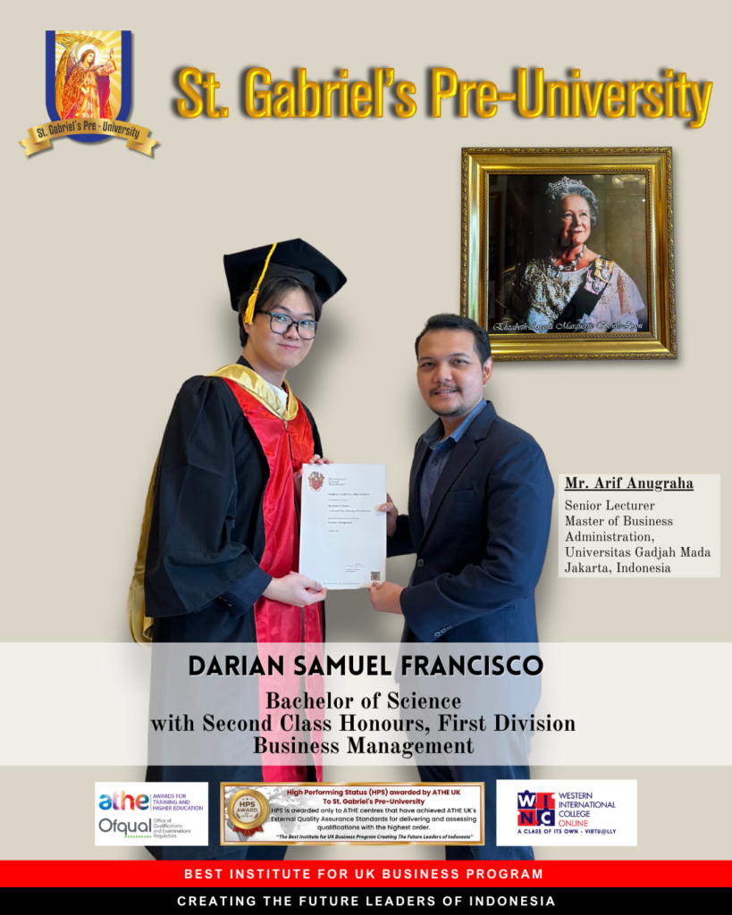 The hybrid learning model—combining live online lectures from WINC (UK University) with academic guidance and on-ground support from St. Gabriel’s lecturers—allowed Darian to experience authentic British education while studying locally. The program’s international focus also equipped him with a global business mindset, preparing him to operate effectively in diverse professional environments.